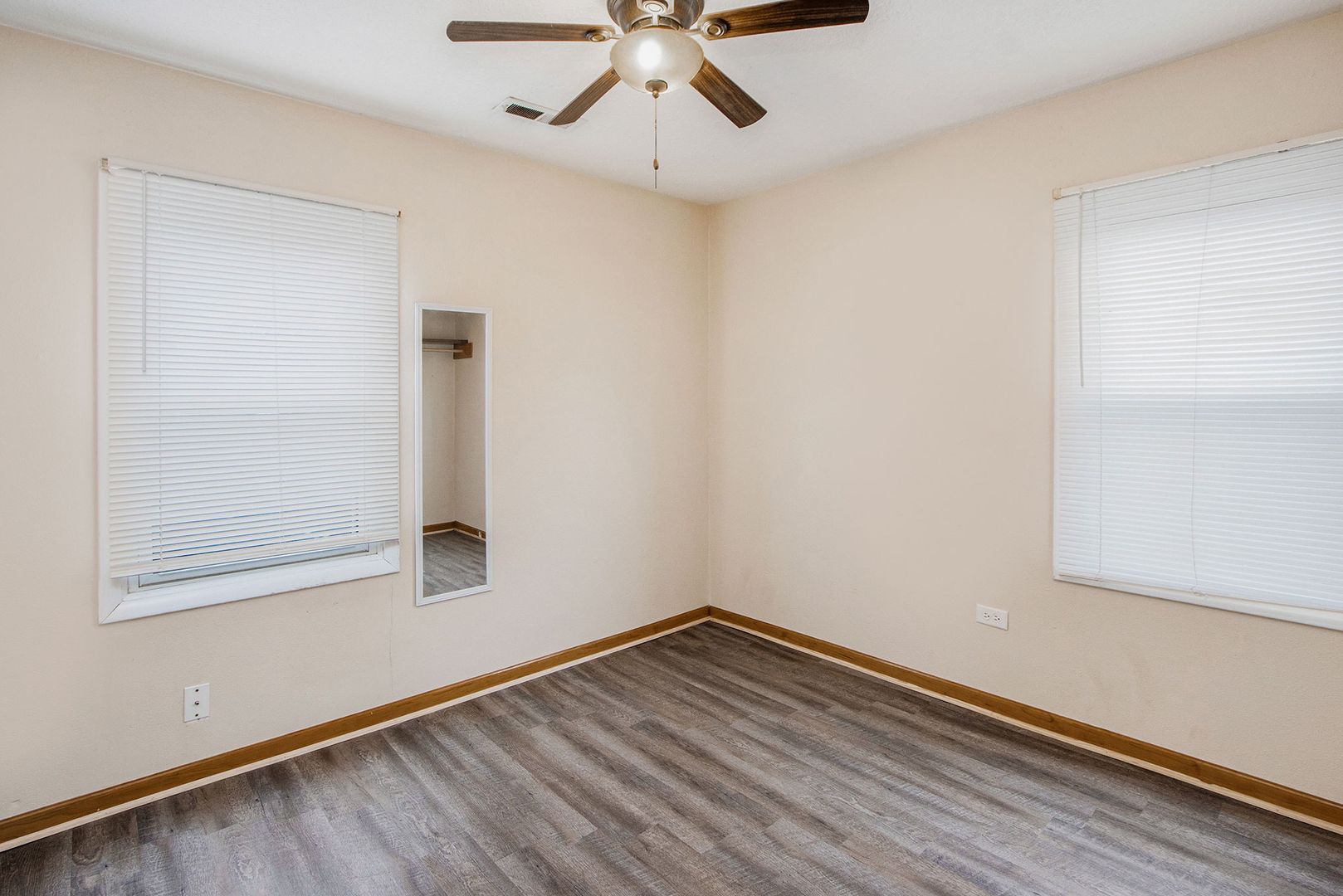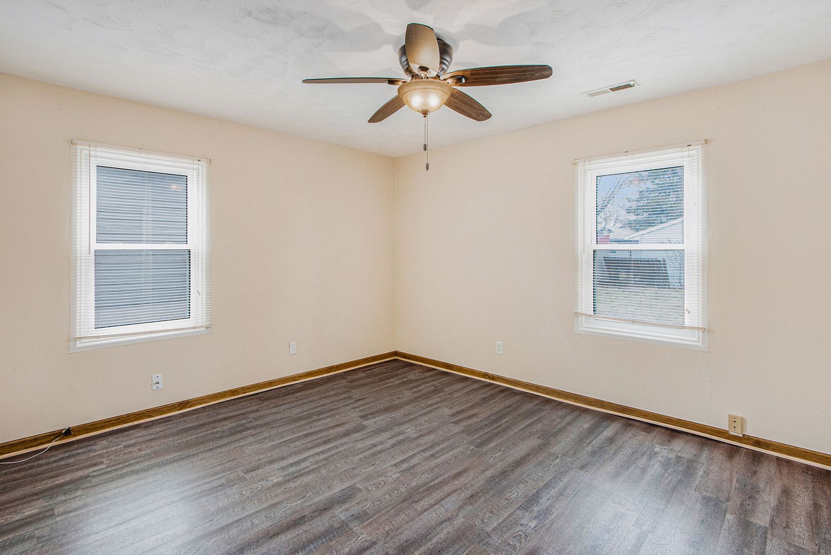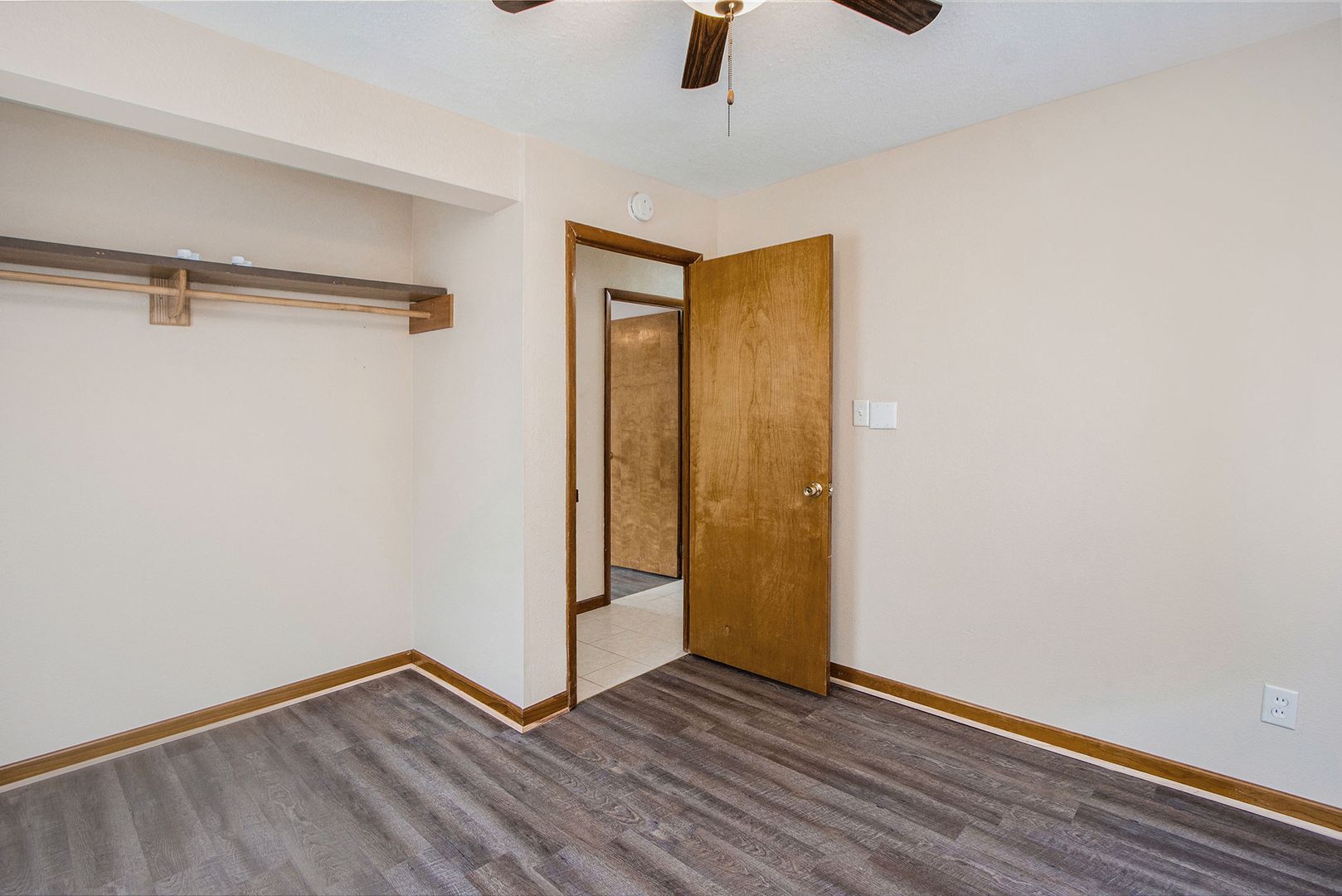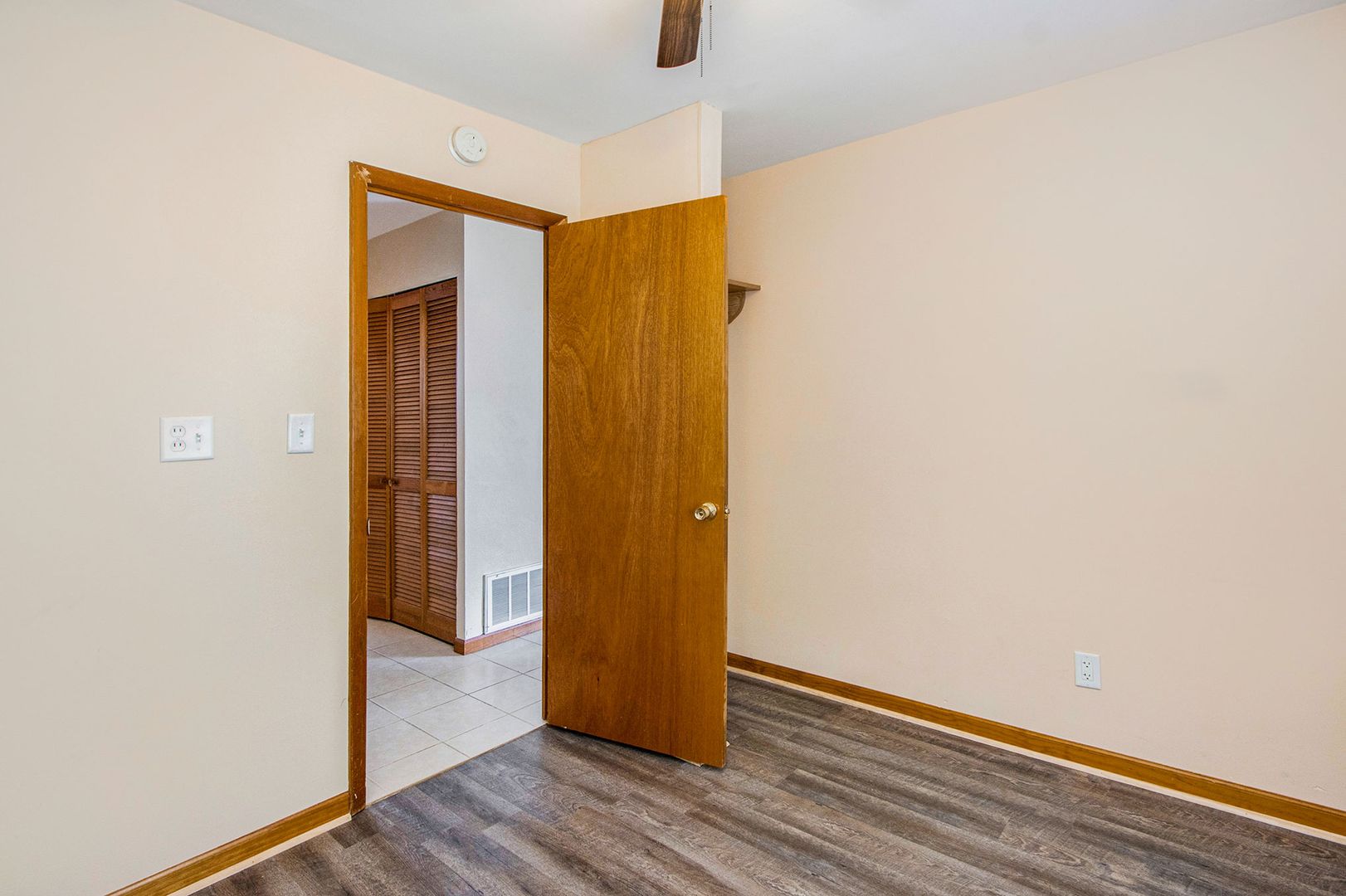 *Attractive wood-style laminate flooring in living room and bedrooms, with durable porcelain tile in kitchen and hallway