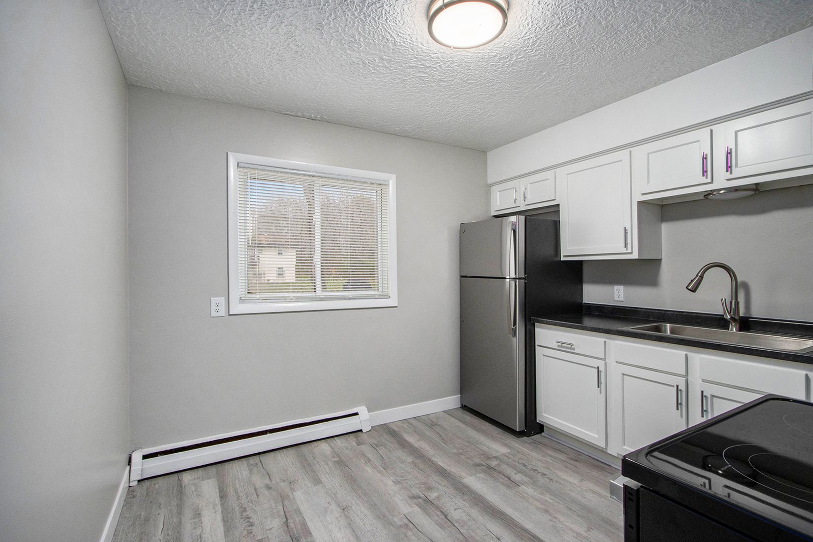 *Kitchen with brand new cabinets, new counter work surfaces, and stainless steel fridge, and range.