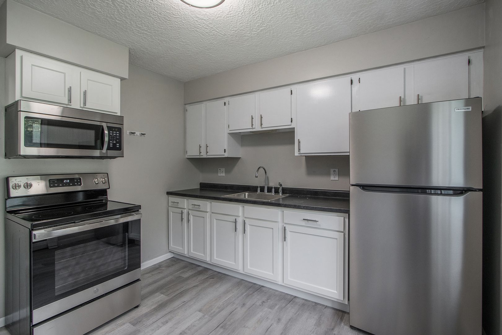 *Kitchen with brand new cabinets, new counter work surfaces, and stainless steel fridge, and range.